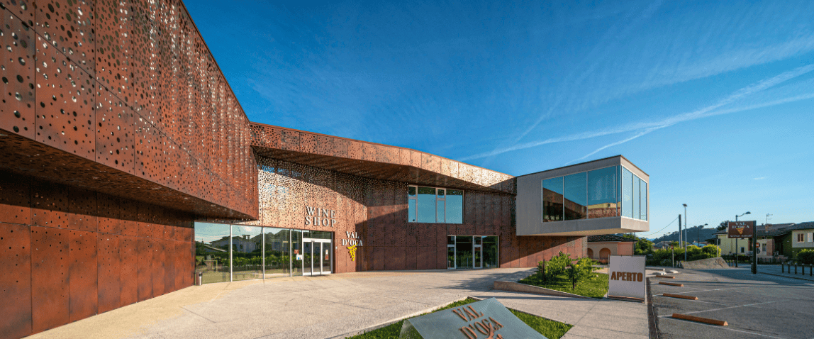 Il Wine Center si caratterizza anche per la particolare architettura che ospita gli spazi aperti al pubblico, la cui facciata è un inno spumeggiante al Prosecco.